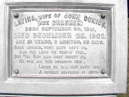Lavina DRASHER [Parents] [image] was born on 30 Sep 1841 in Drums, Butler TWP, Luzerne County, Pennsylvania. She died on 28 Dec 1902 in Drums, Butler TWP, Luzerne County, Pennsylvania. She was buried on 1 Jan 1903 in St. Johns Cemetery, St. Johns, Butler TWP, Luzerne County, Pennsylvania. She married John CUNIUS in 1865.
